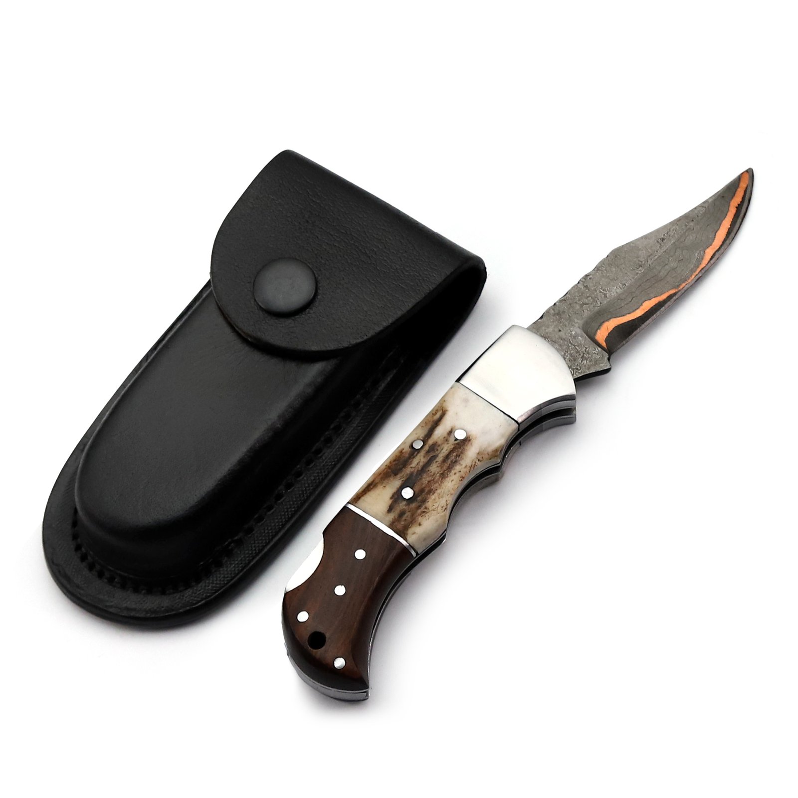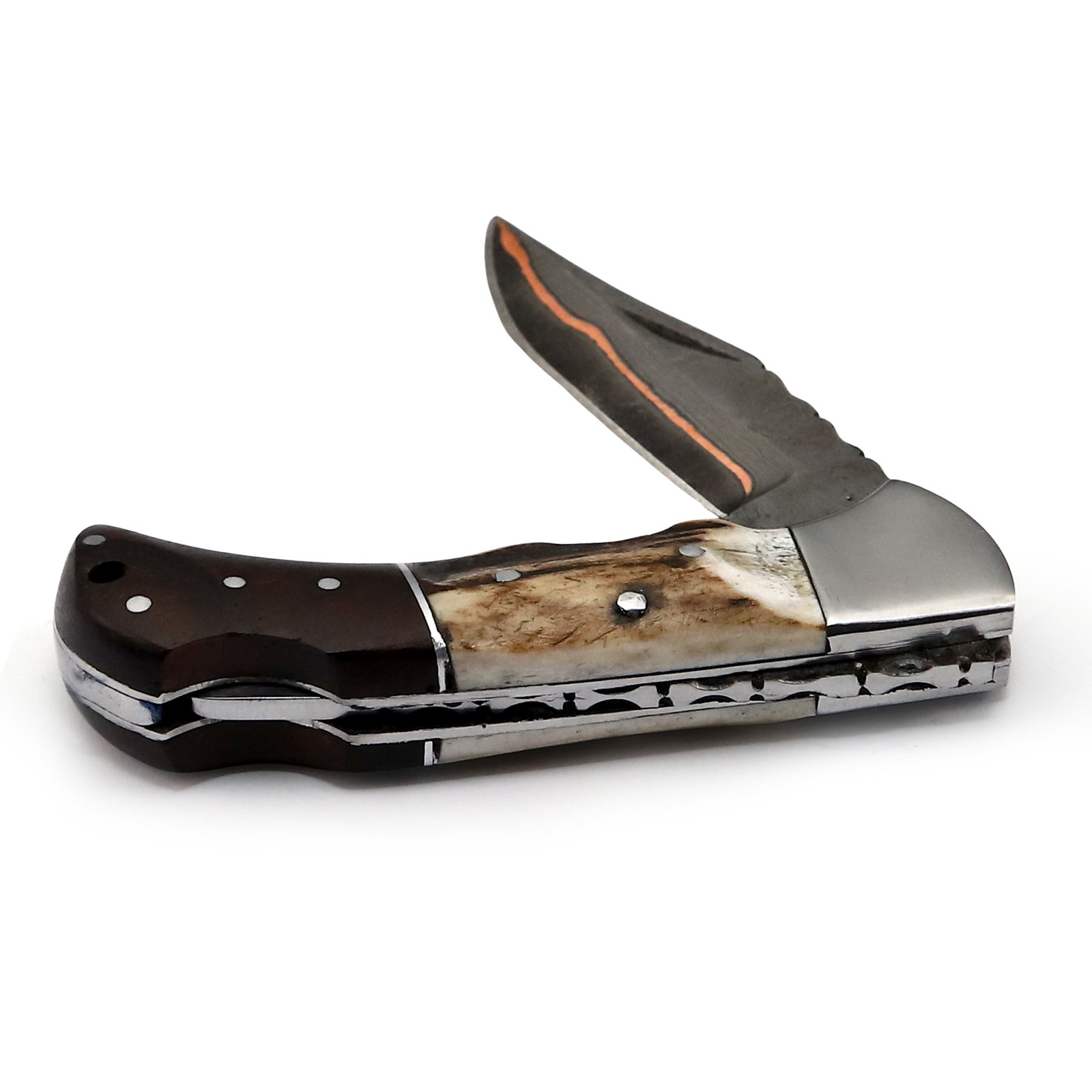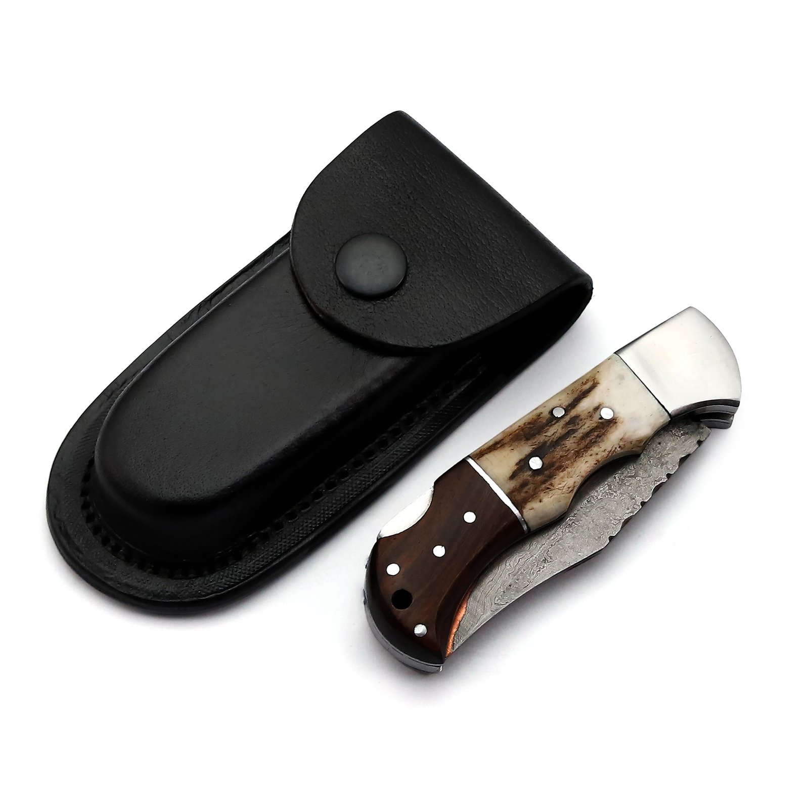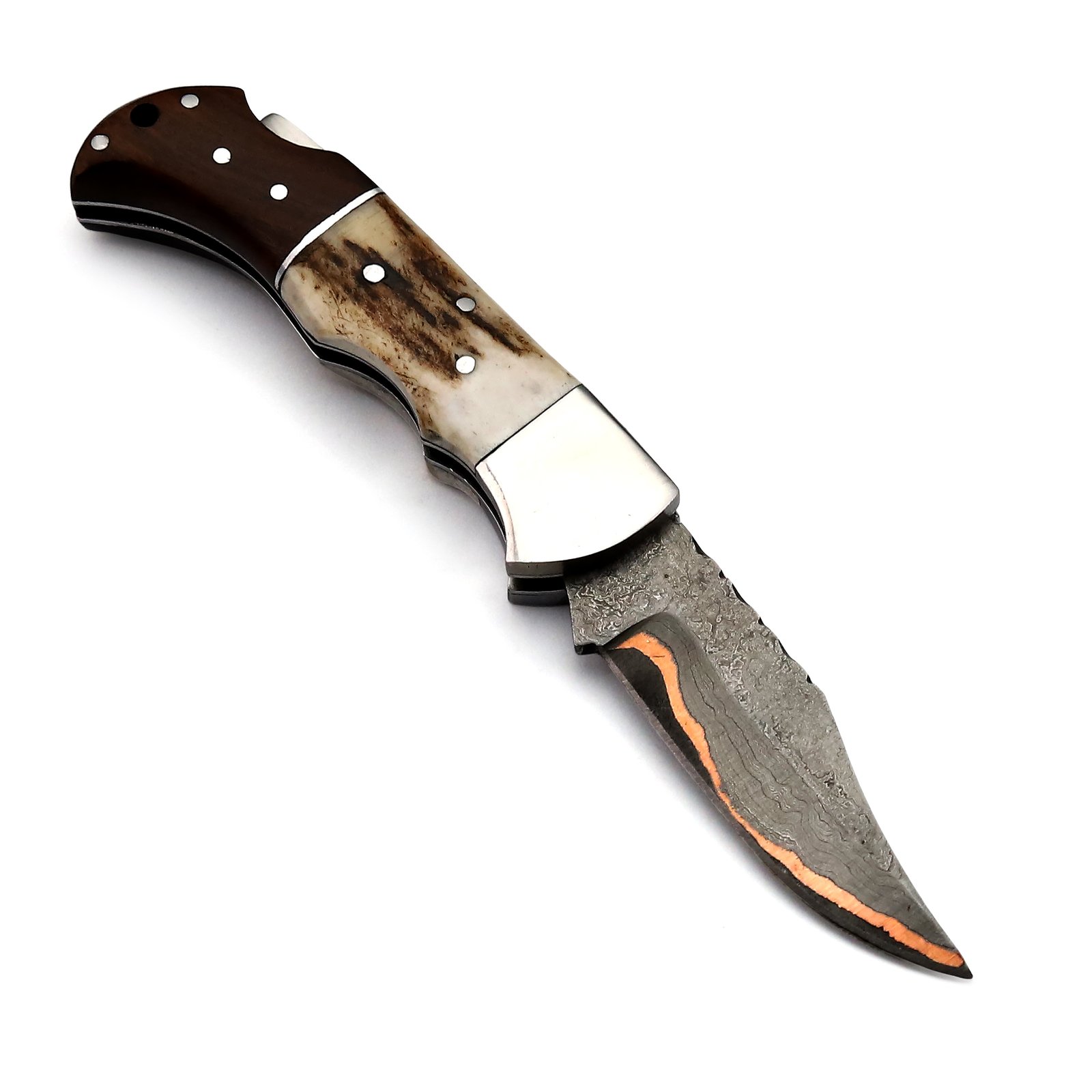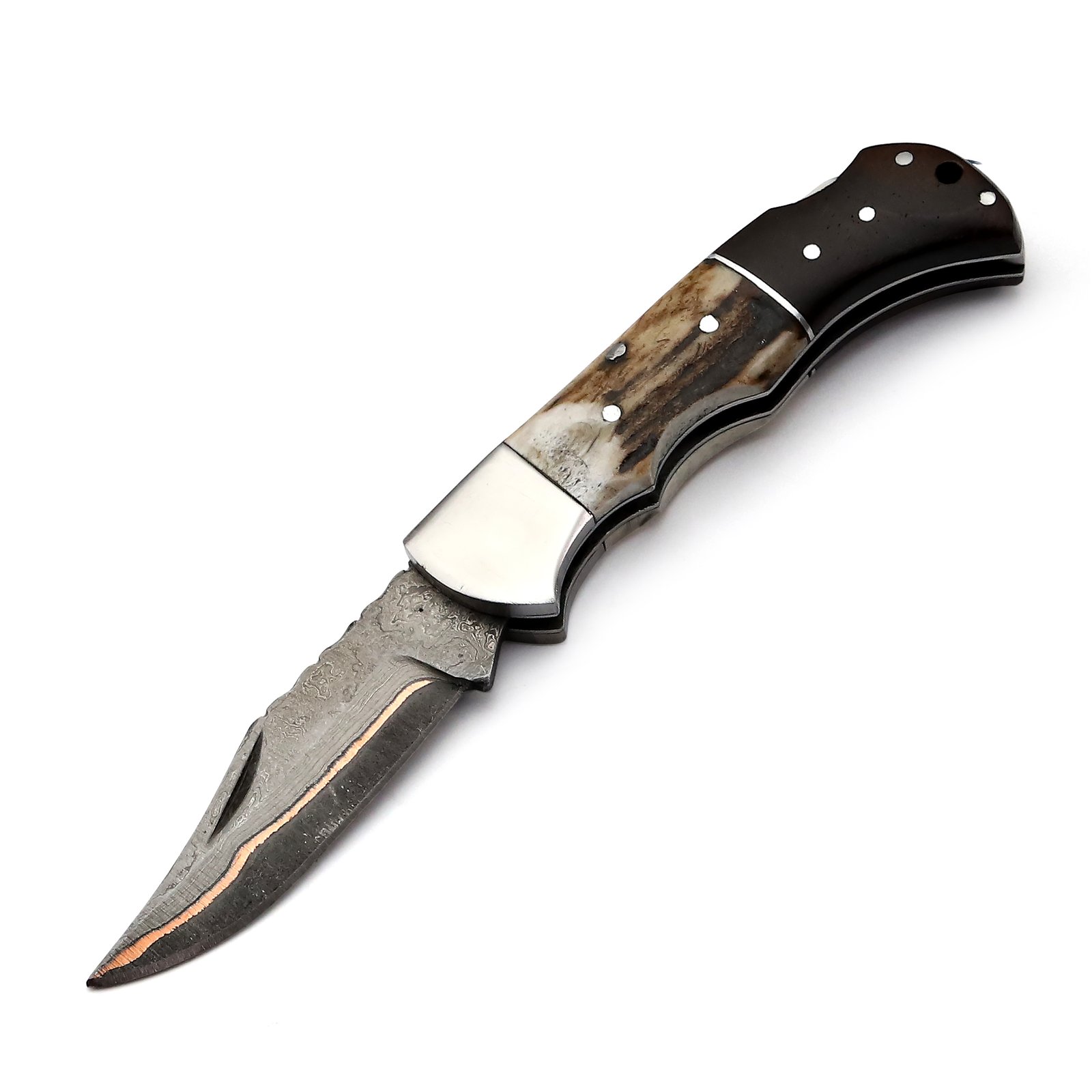 GK-023 Damascus Pocket Knife with Coupler Inlay & Stag/Wood Handle