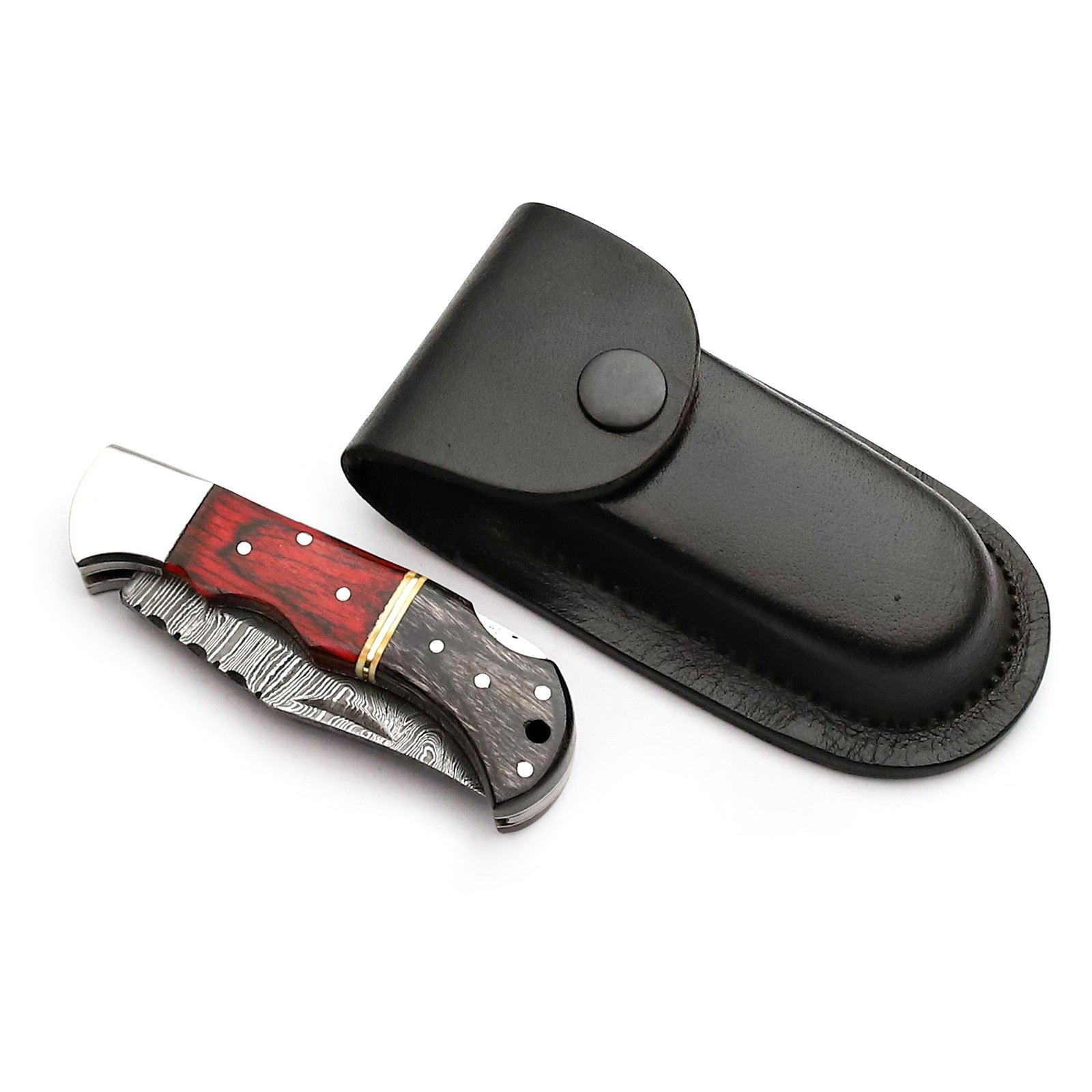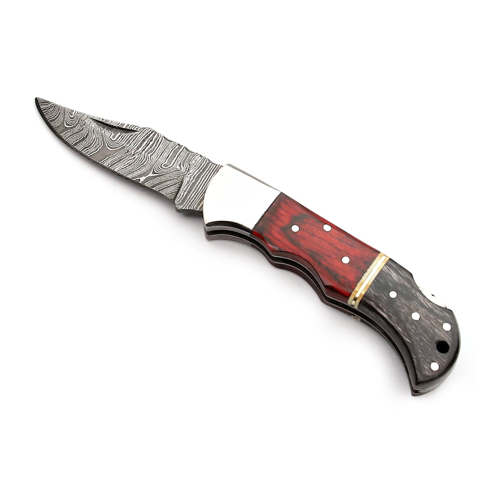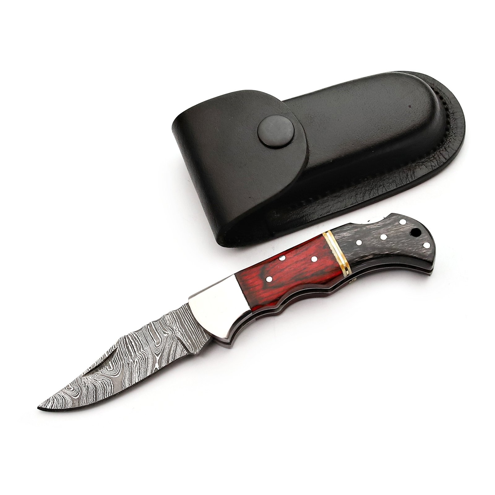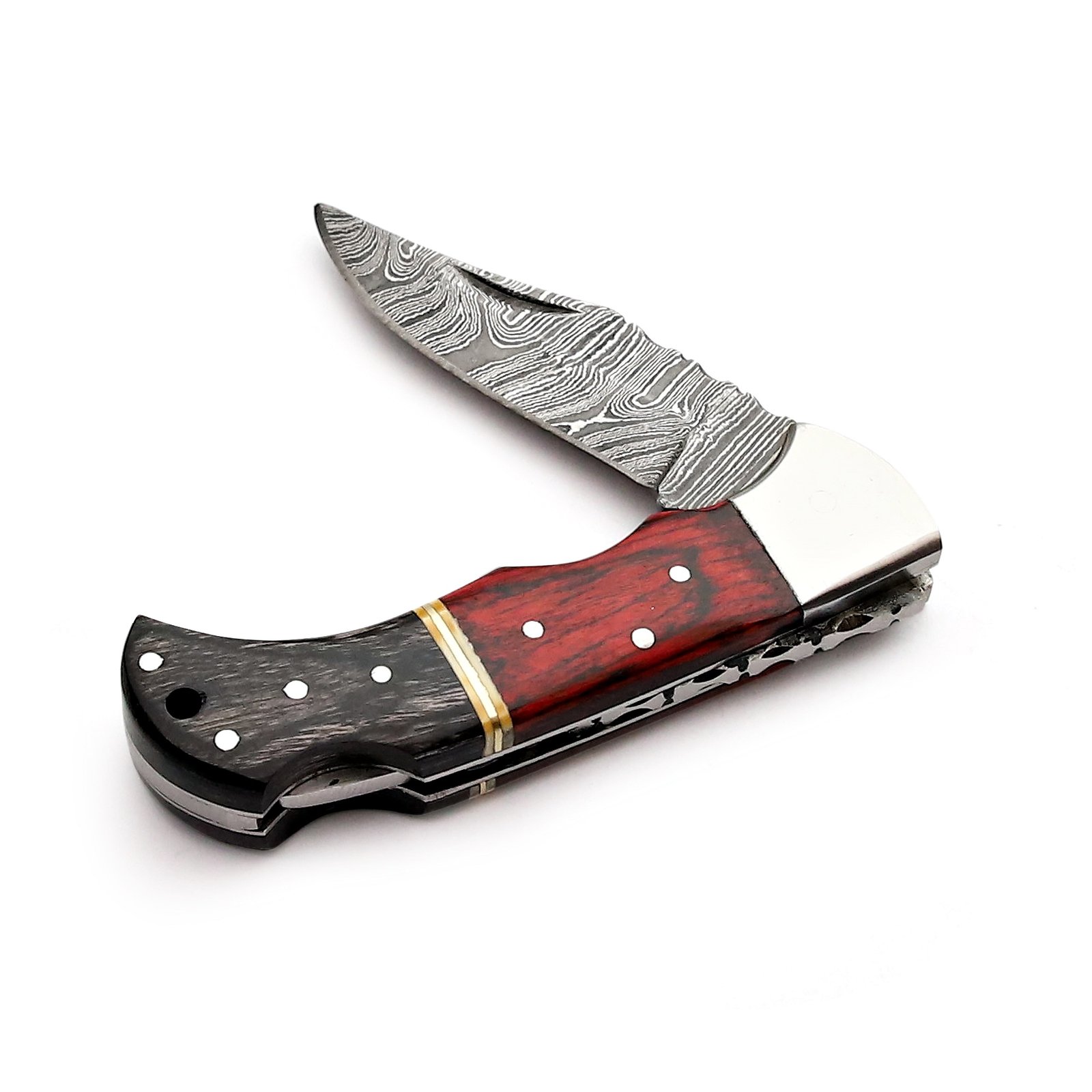 GK-025A Pocket Knife, Damascus Blade, Pekka Wood Grey/Red