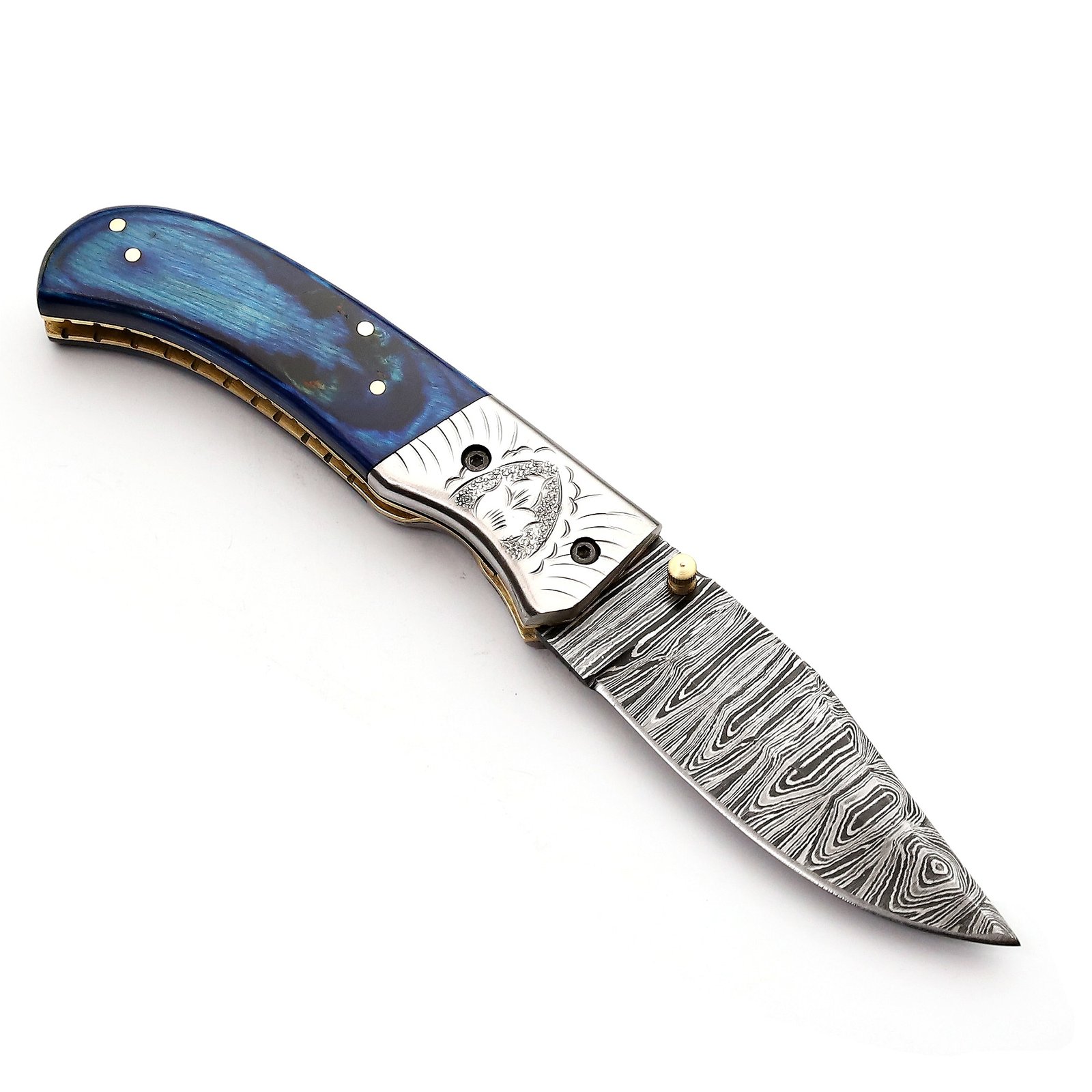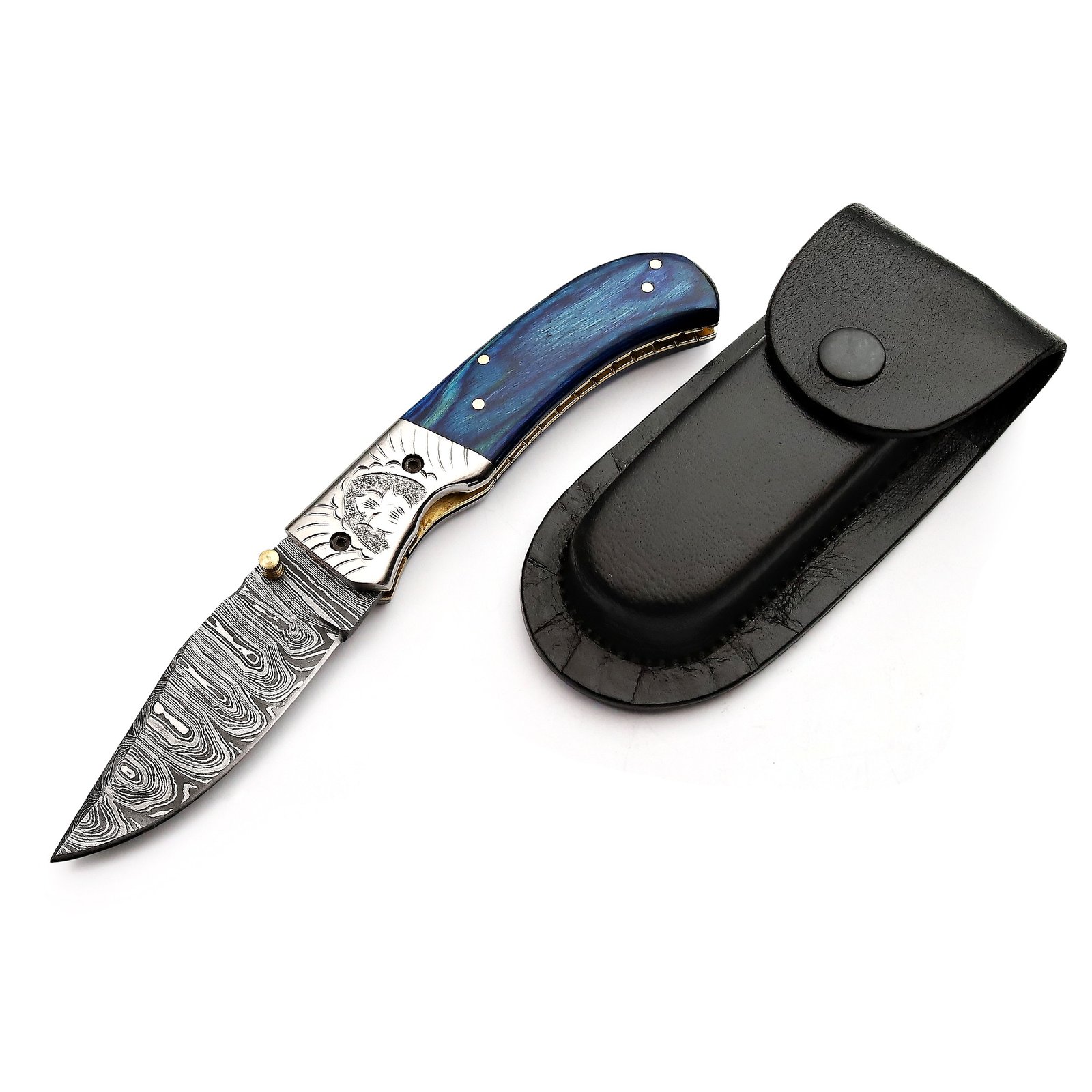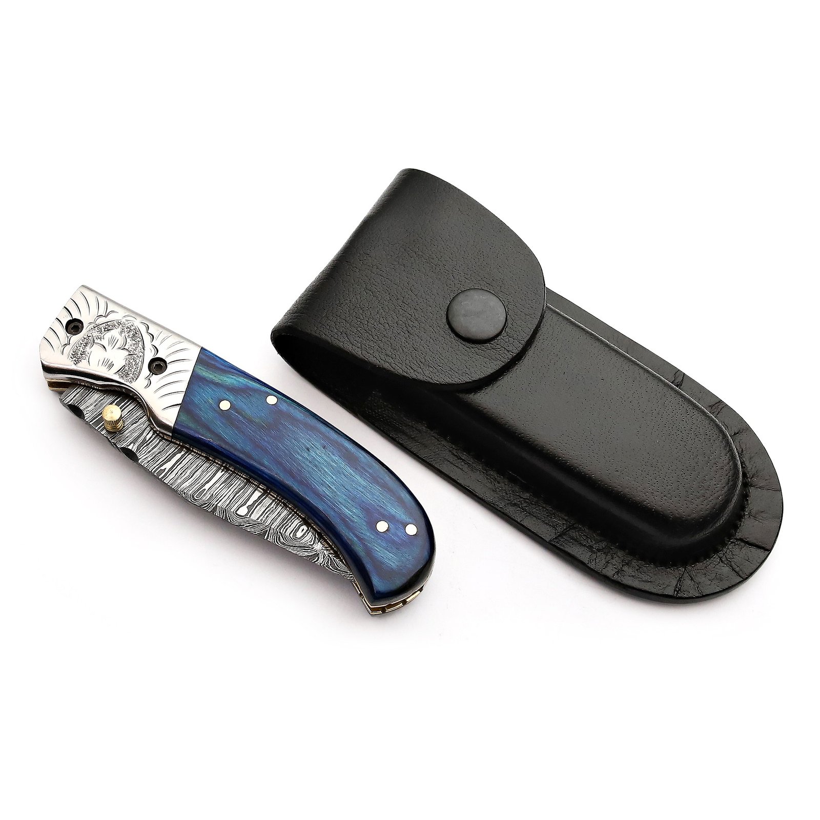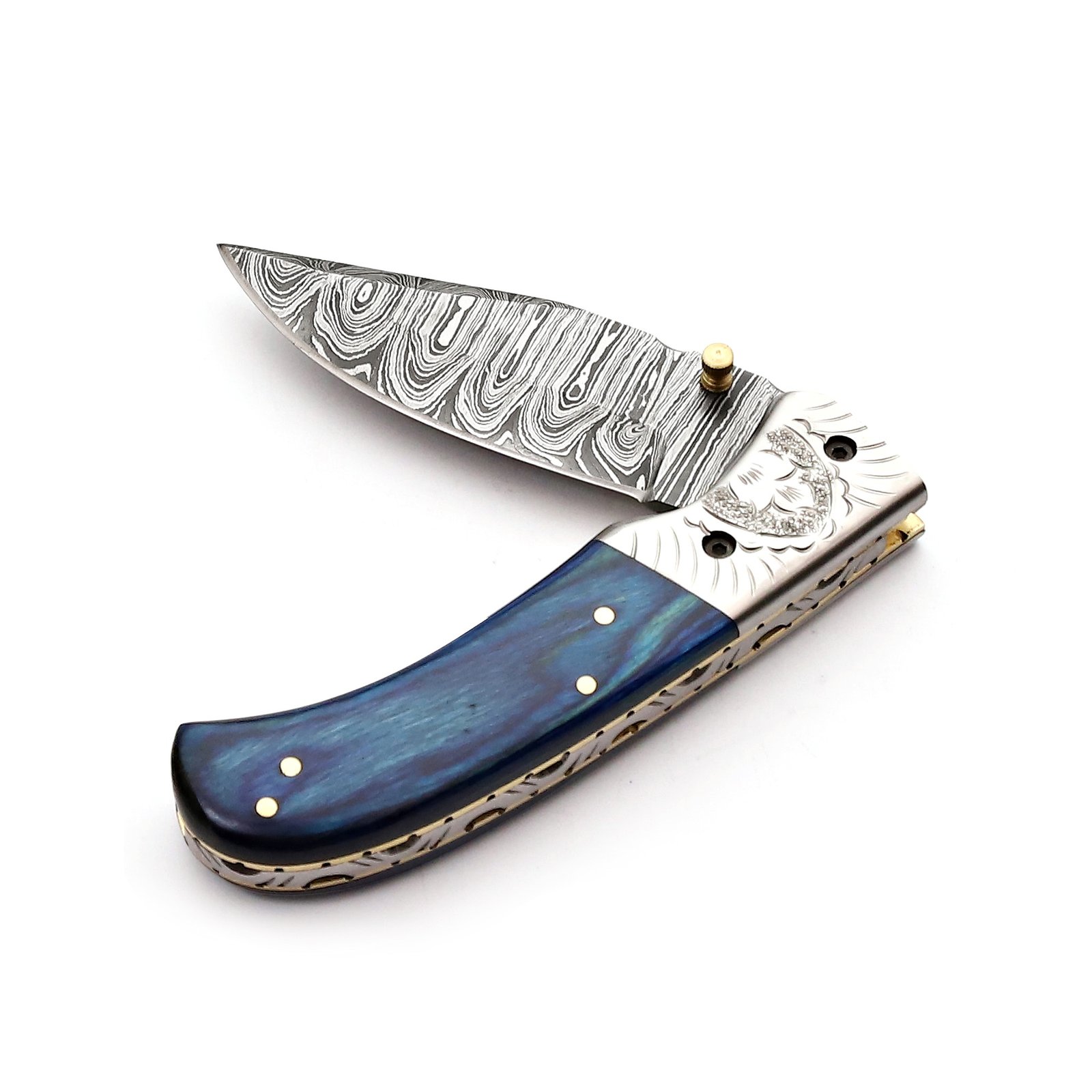 GK-039 Damascus Pocket Knife Blue Micarta Handle