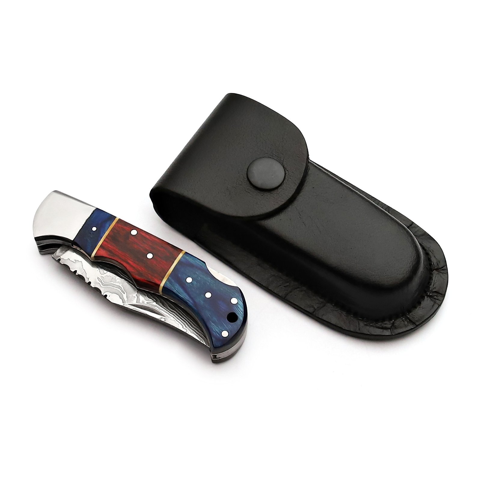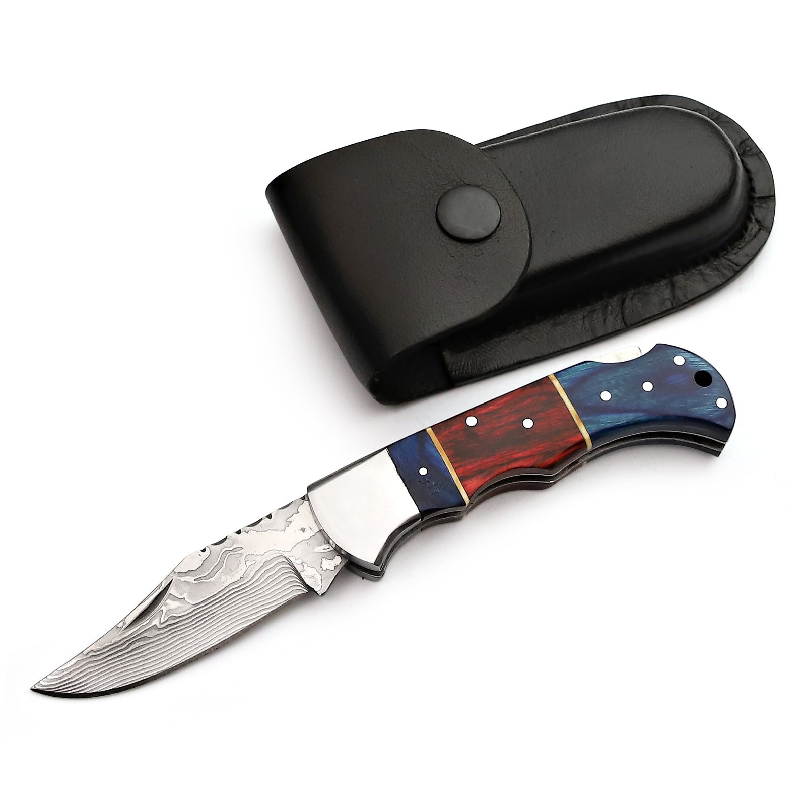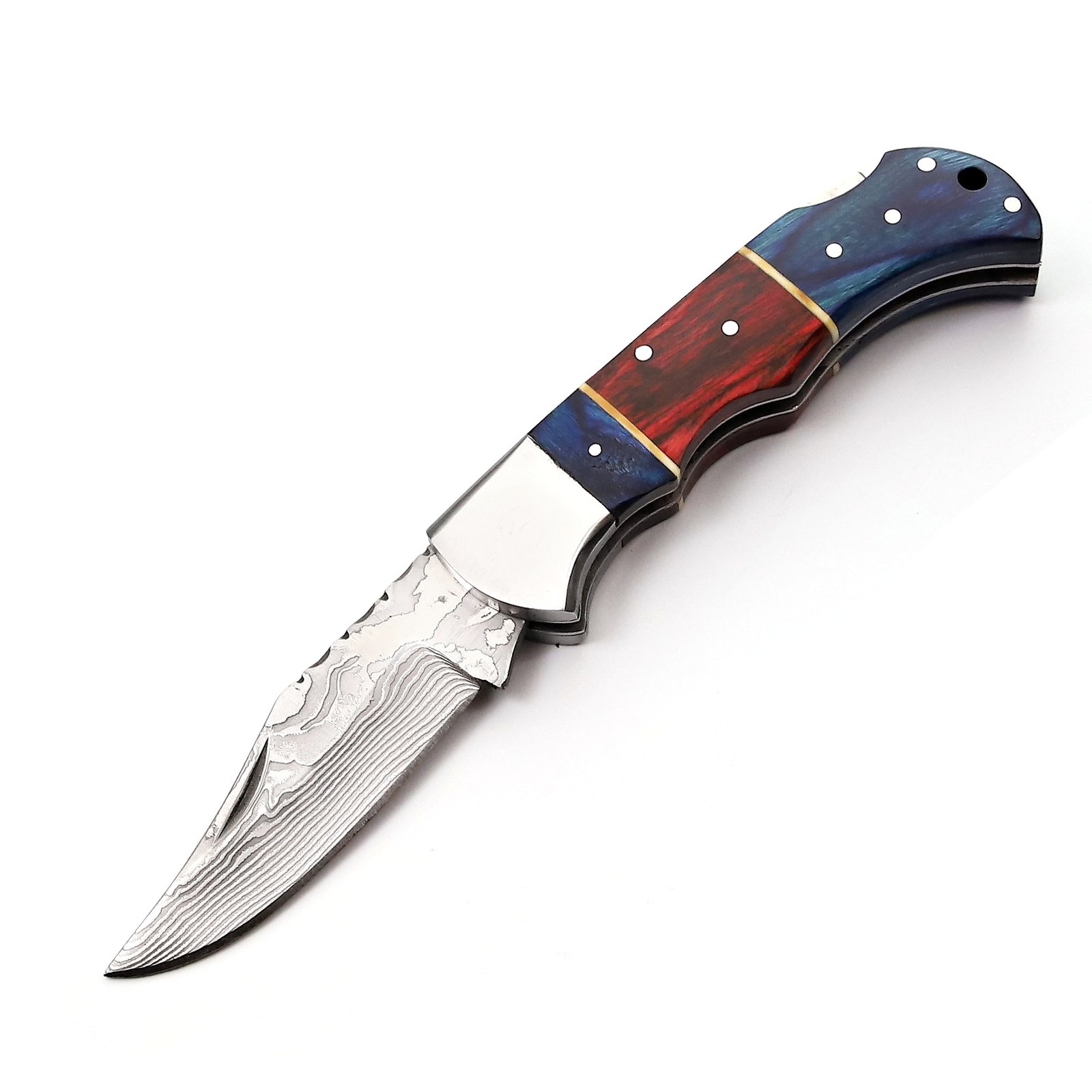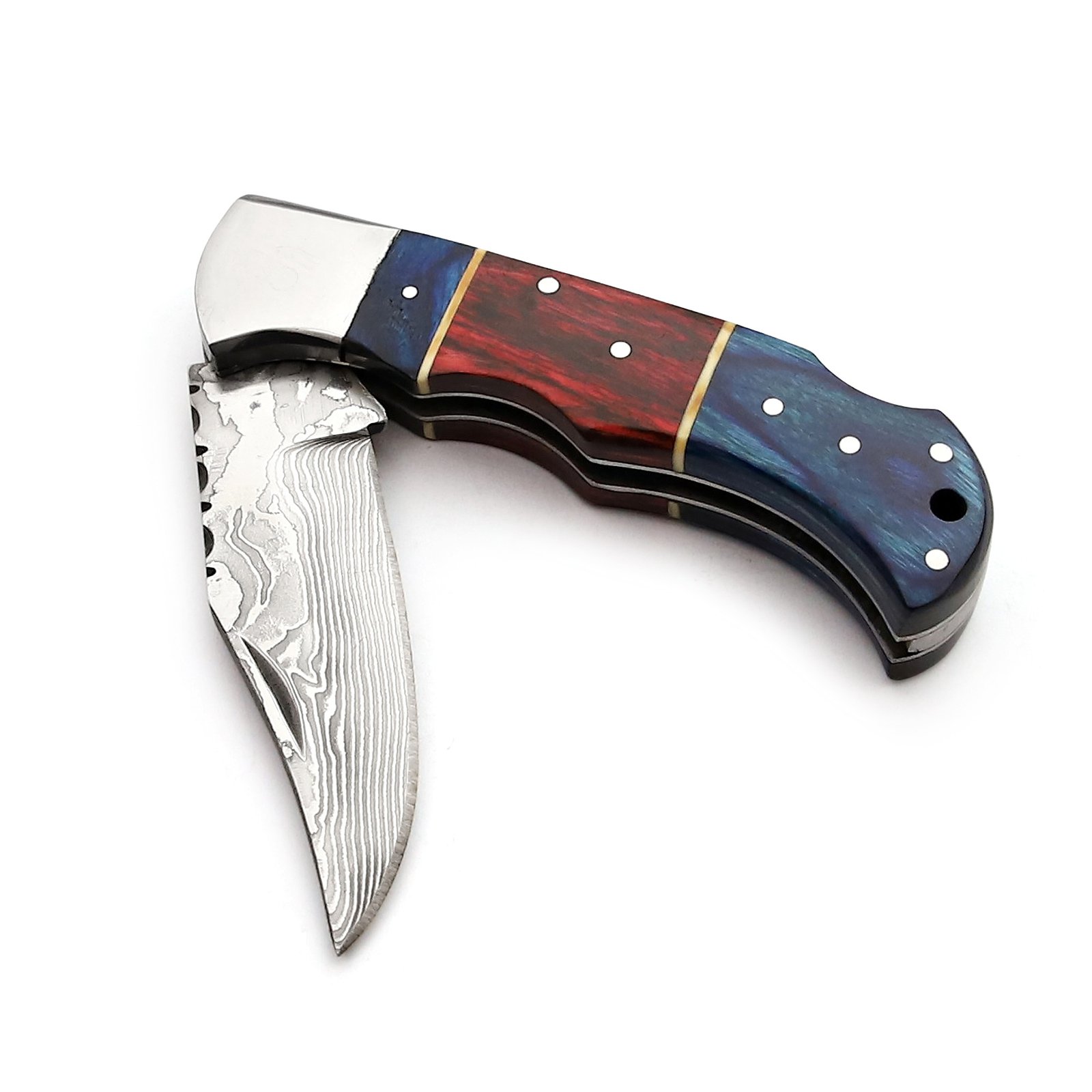 GK-047 Pocket Knife Stainless Steel Damascus, Pekka wood Blue/Red