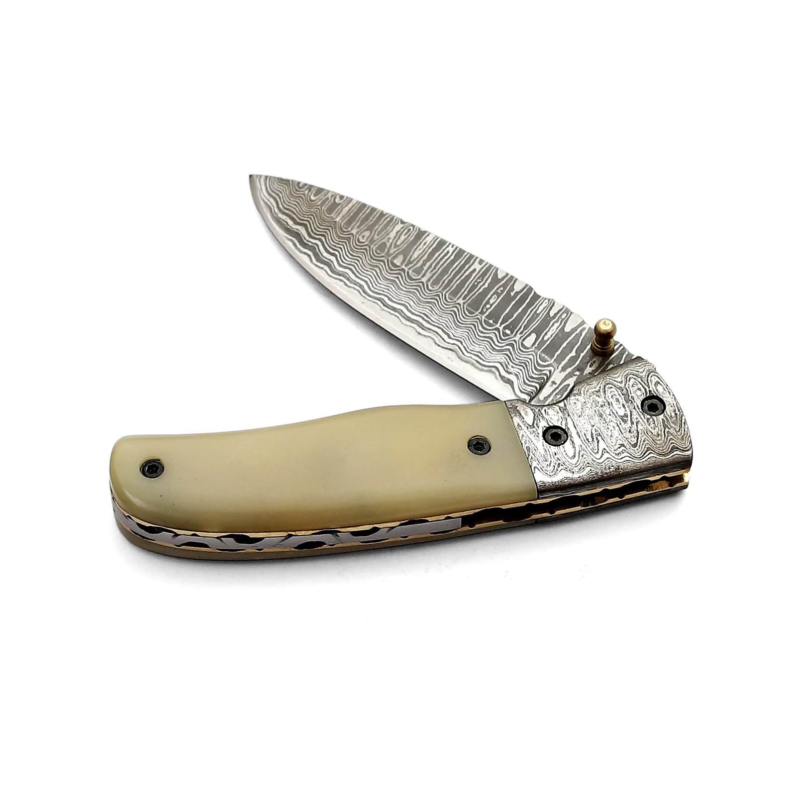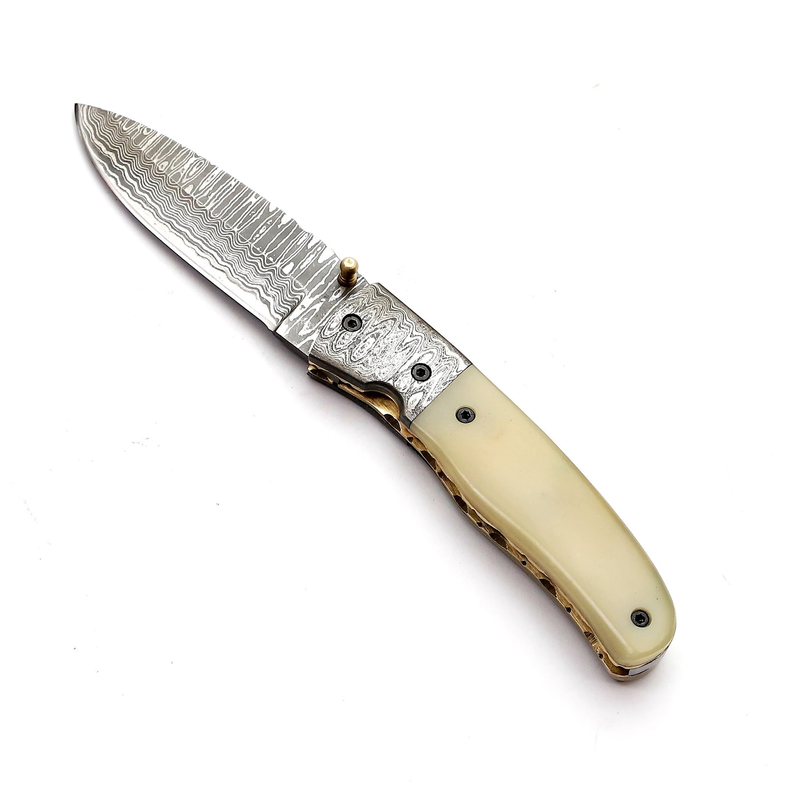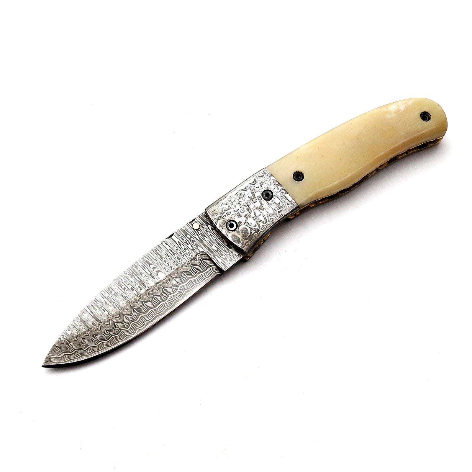 QAS-008 Damascuss Pocket Knife with Camel Bone Handle